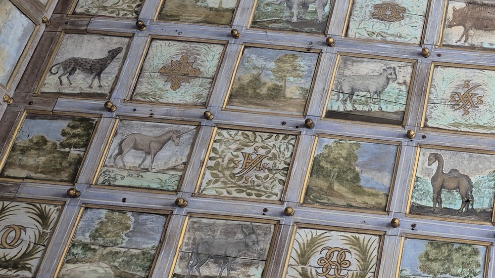 Petit bond dans le temps : aux environs de 1630, une licorne figure au plafond à caissons de la Galerie des Peintures.